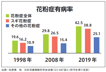 花粉症を有している人数は正確には分かっていませんが、全国的な調査によると花粉症を有する人の割合は1998年の19.6%から2019年には42.5%へと増加傾向です。