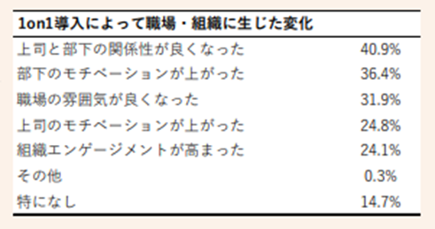 1on1ミーティングによって生じた職場の変化は以下のとおりです。